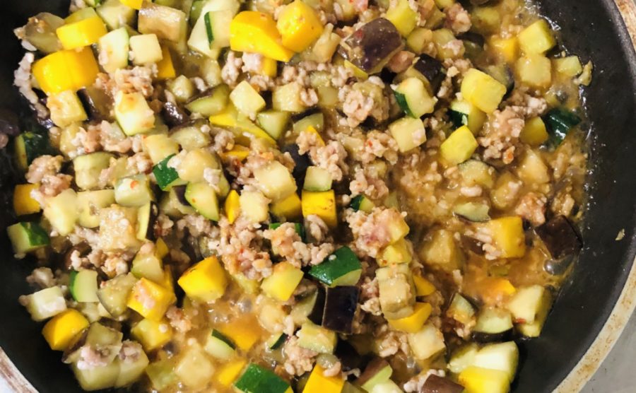 | ② | 茄子とズッキーニは1cm角に切る。 | |