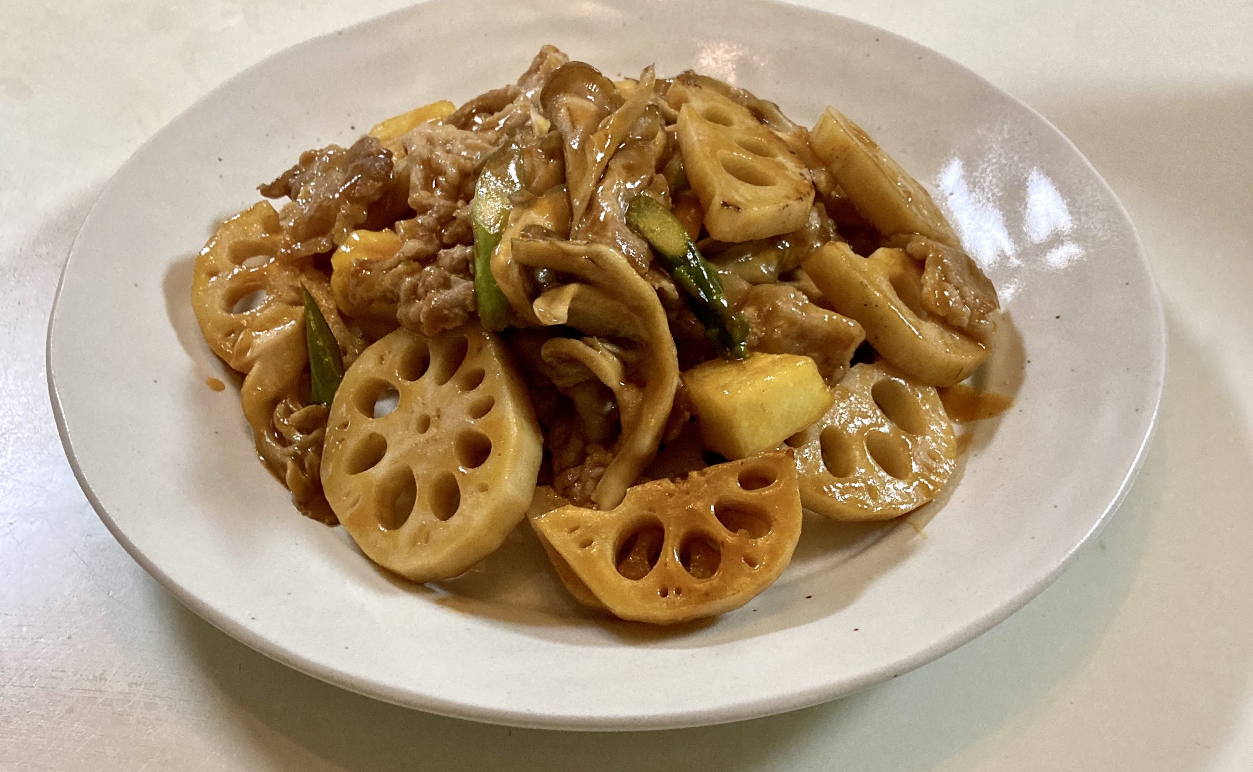 | ④ | フライパンを熱してごま油を入れ、①の豚肉をさっと炒めら、しょうが、きのこも入れてさっと炒め、ふたをして3〜5分蒸し焼きにする。 | |