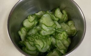 きゅうりは薄い小口切りにして、塩少々で揉み5分ほど置いて水気を切って b で和えておく。